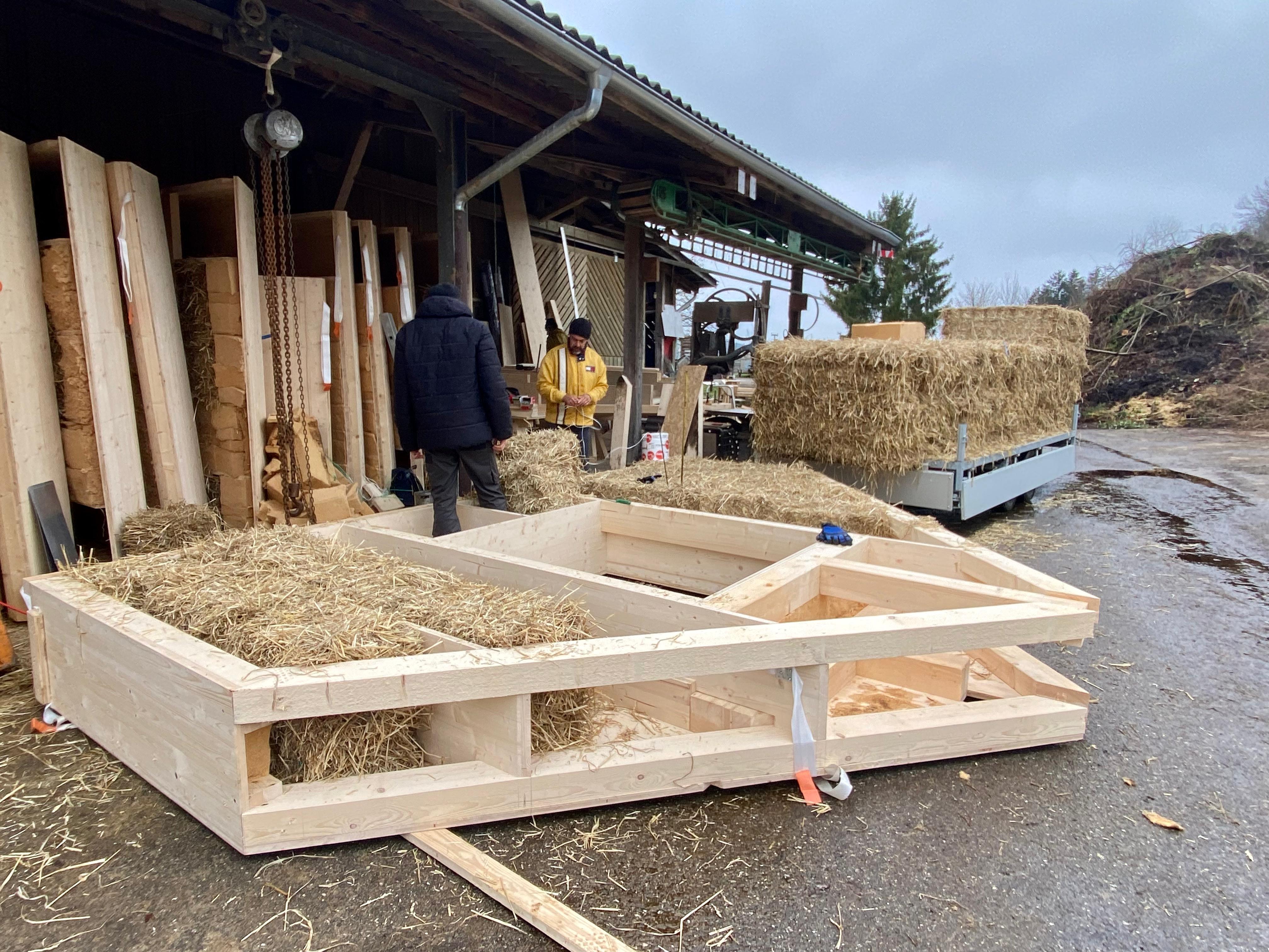 C'est terminé ! Tous les murs porteurs de la première maison sont remplis de paille. En deux mois, on a produit et rempli tous ces caissons. Il reste deux jours de travail chez Christophe pour finir les éléments, mais l'essentiel est fait.