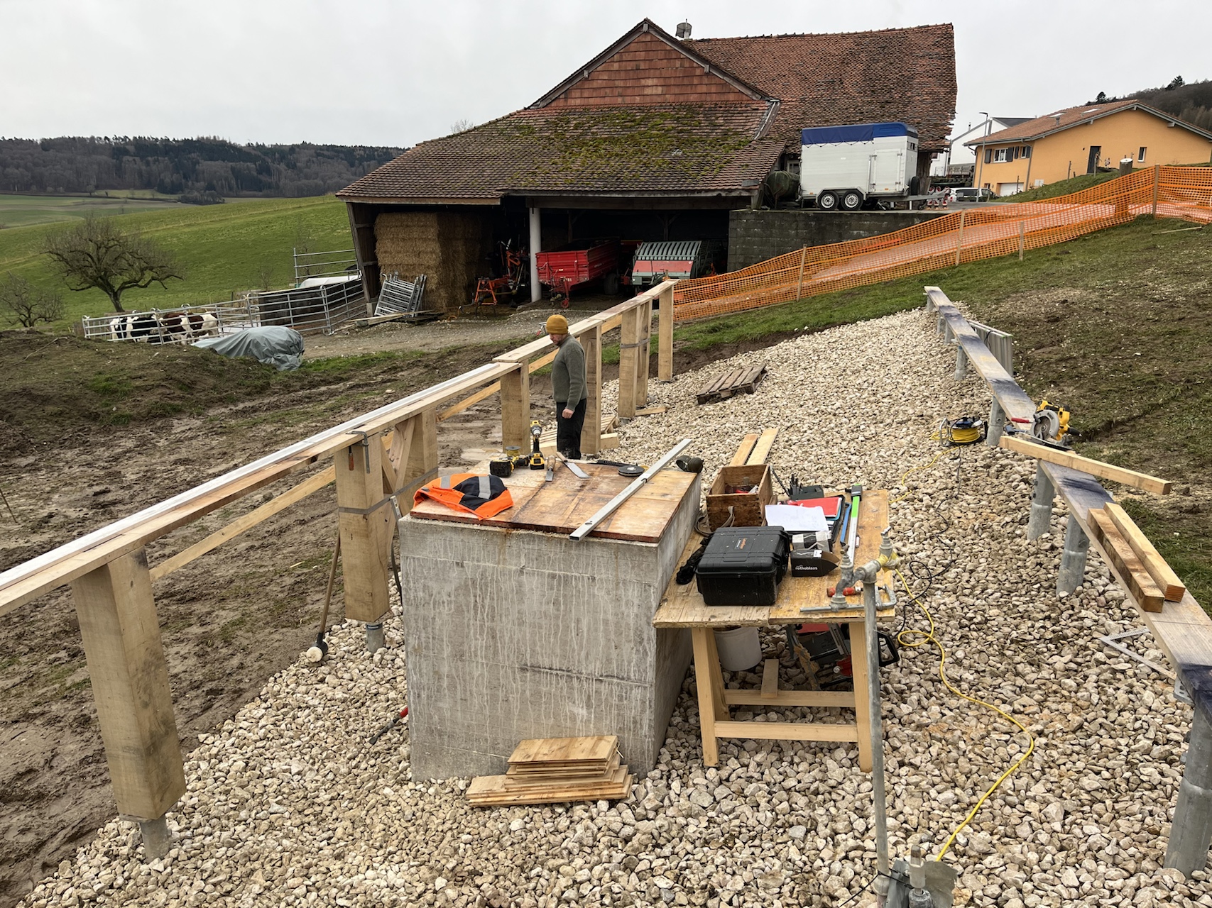 Juste avant Noël, pendant la pause, on a complété plusieurs travaux importants. Les canalisations et les raccordements d'eau et d'électricité ont été posés entre les deux maisons, vers la cuve d'eau de pluie et le puits. La gaine technique de la maison Ouest a aussi été coulée.