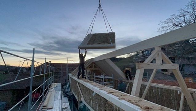 On termine de remplir les rangées manquantes des caissons de toiture avec de la paille. C’était nécessaire pour assembler les caissons entre eux. C’est du travail en altitude, mais l’équipe a bien avancé.