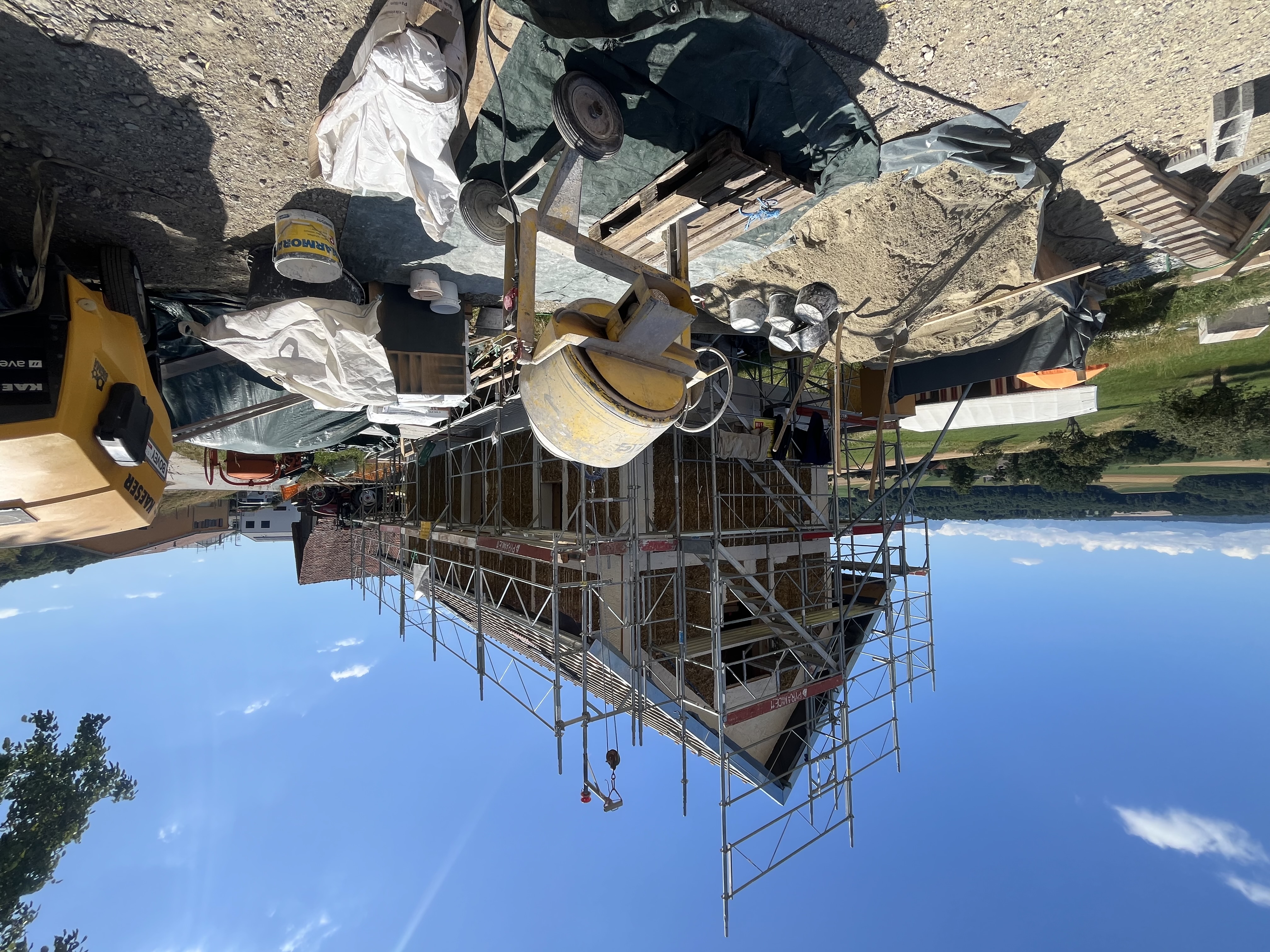 C'est parti ! Depuis hier, 10 juillet, nous avons lancé la projection de l'enduit à la chaux sur les façades.
