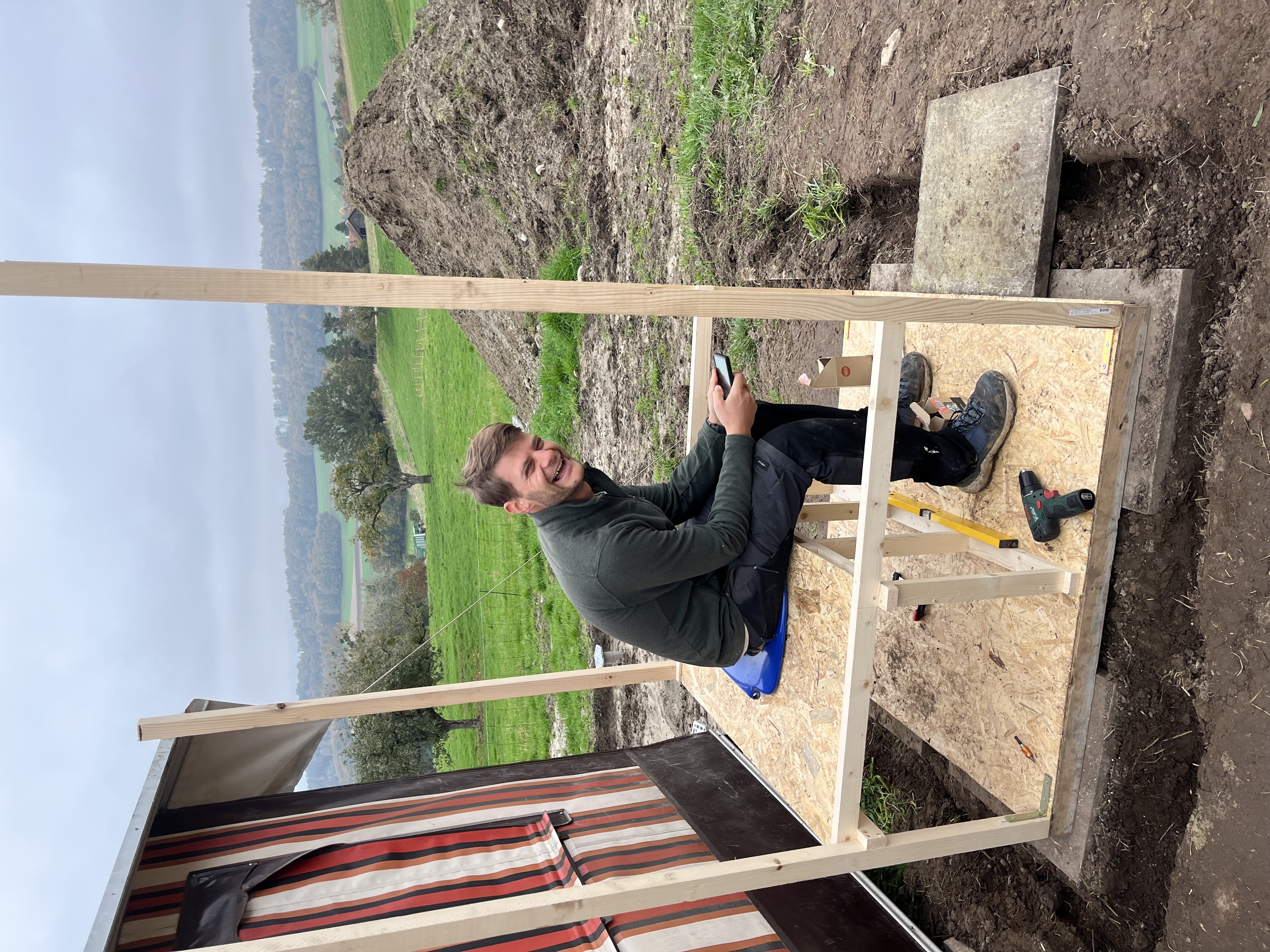 En octobre, il faut se préparer à accueillir les volontaires. On récupère une vieille caravane d’un camping à Yverdon, avec son auvent. C’est utile pour avoir un endroit à l’abri où manger et entreposer les outils.